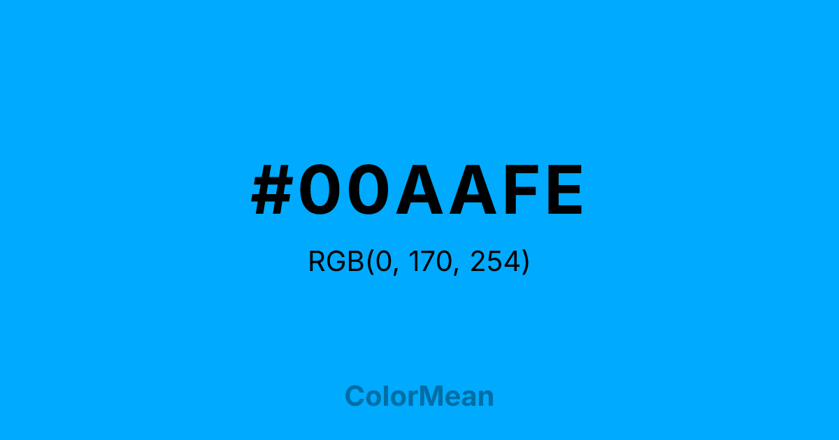 #00AAFE RGB value is (0, 170, 254). The hex color red value is 0, green is 170, and blue is 254. Its HSL format shows a hue of 200°, saturation of 100 percent, and lightness of 50 percent. The CMYK process values are 100 percent, 33 percent, 0 percent, 0 percent.