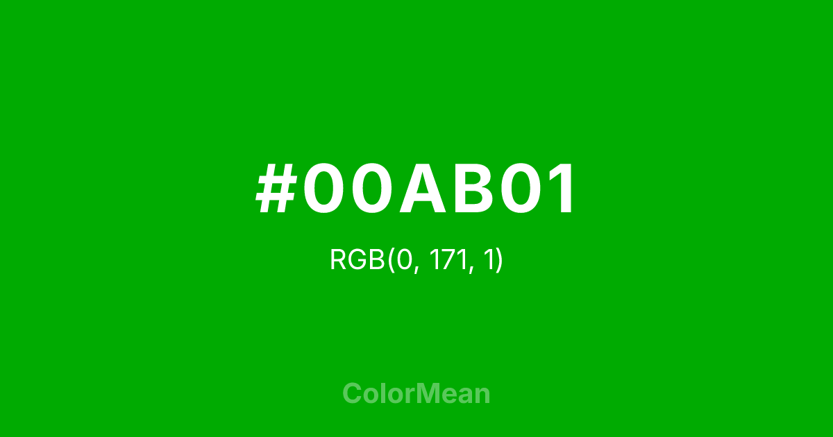 #00AB01 RGB value is (0, 171, 1). The hex color red value is 0, green is 171, and blue is 1. Its HSL format shows a hue of 120°, saturation of 100 percent, and lightness of 34 percent. The CMYK process values are 100 percent, 0 percent, 99 percent, 33 percent.