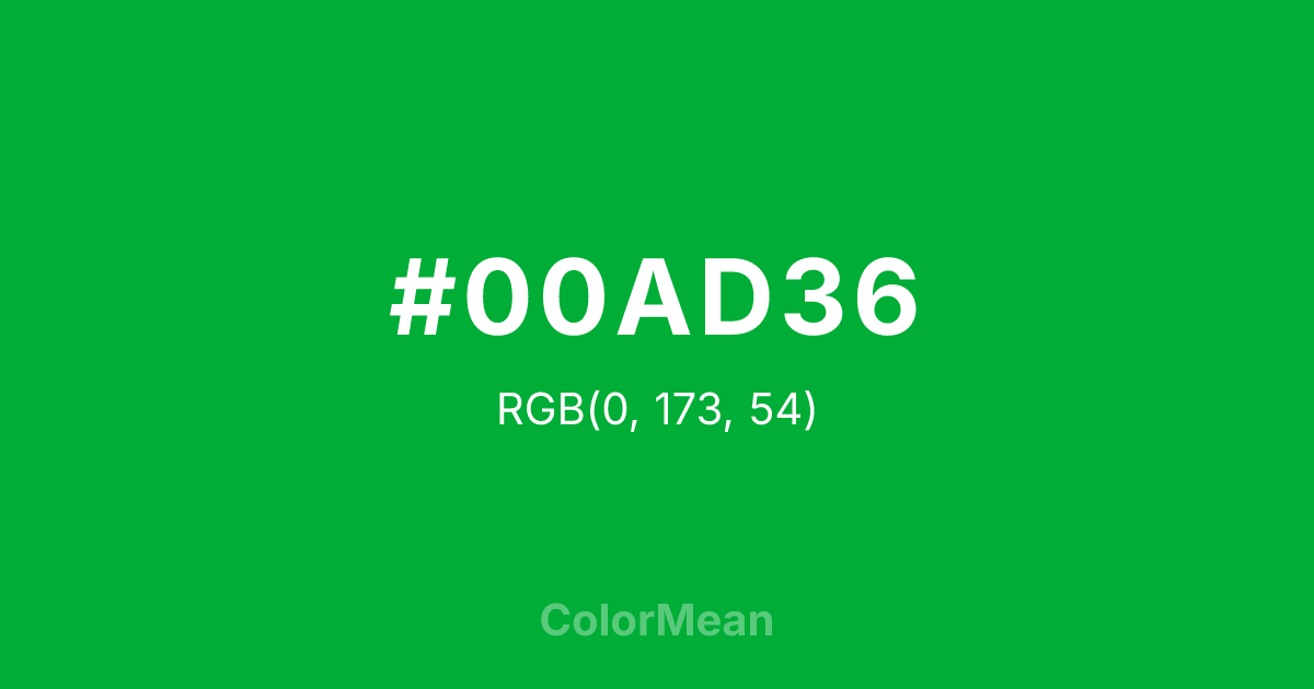 #00AD36 RGB value is (0, 173, 54). The hex color red value is 0, green is 173, and blue is 54. Its HSL format shows a hue of 139°, saturation of 100 percent, and lightness of 34 percent. The CMYK process values are 100 percent, 0 percent, 69 percent, 32 percent.