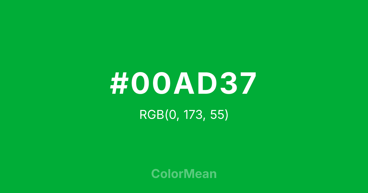 #00AD37 RGB value is (0, 173, 55). The hex color red value is 0, green is 173, and blue is 55. Its HSL format shows a hue of 139°, saturation of 100 percent, and lightness of 34 percent. The CMYK process values are 100 percent, 0 percent, 68 percent, 32 percent.