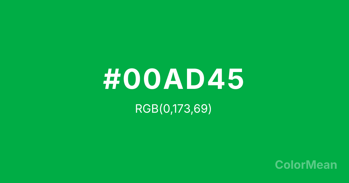 #00AD45 RGB value is (0, 173, 69). The hex color red value is 0, green is 173, and blue is 69. Its HSL format shows a hue of 144°, saturation of 100 percent, and lightness of 34 percent. The CMYK process values are 100 percent, 0 percent, 60 percent, 32 percent.