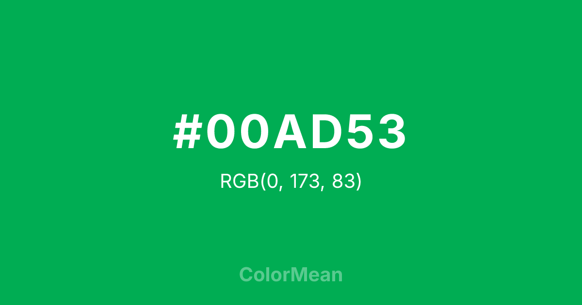 #00AD53 RGB value is (0, 173, 83). The hex color red value is 0, green is 173, and blue is 83. Its HSL format shows a hue of 149°, saturation of 100 percent, and lightness of 34 percent. The CMYK process values are 100 percent, 0 percent, 52 percent, 32 percent.