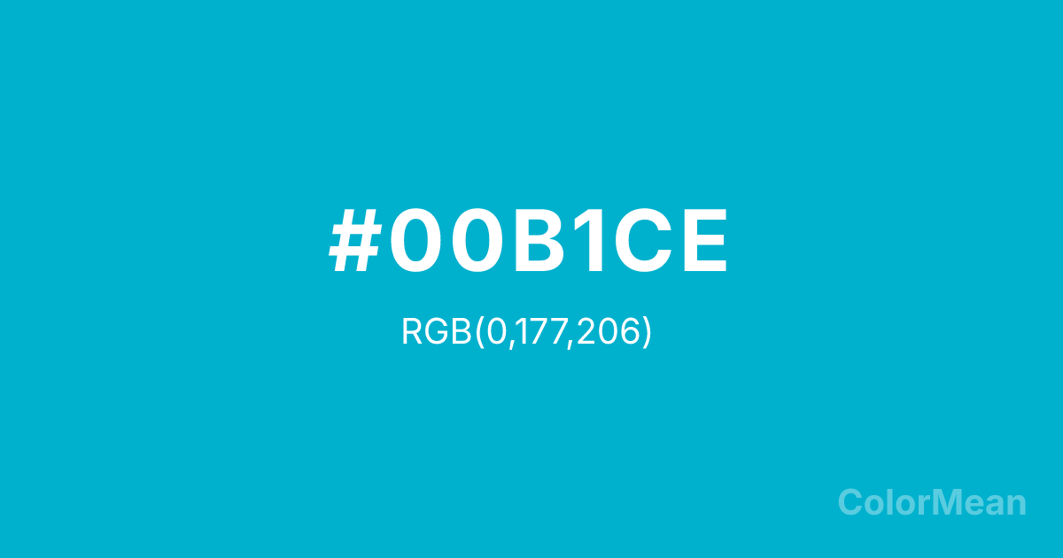 #00B1CE RGB value is (0, 177, 206). The hex color red value is 0, green is 177, and blue is 206. Its HSL format shows a hue of 188°, saturation of 100 percent, and lightness of 40 percent. The CMYK process values are 100 percent, 14 percent, 0 percent, 19 percent.