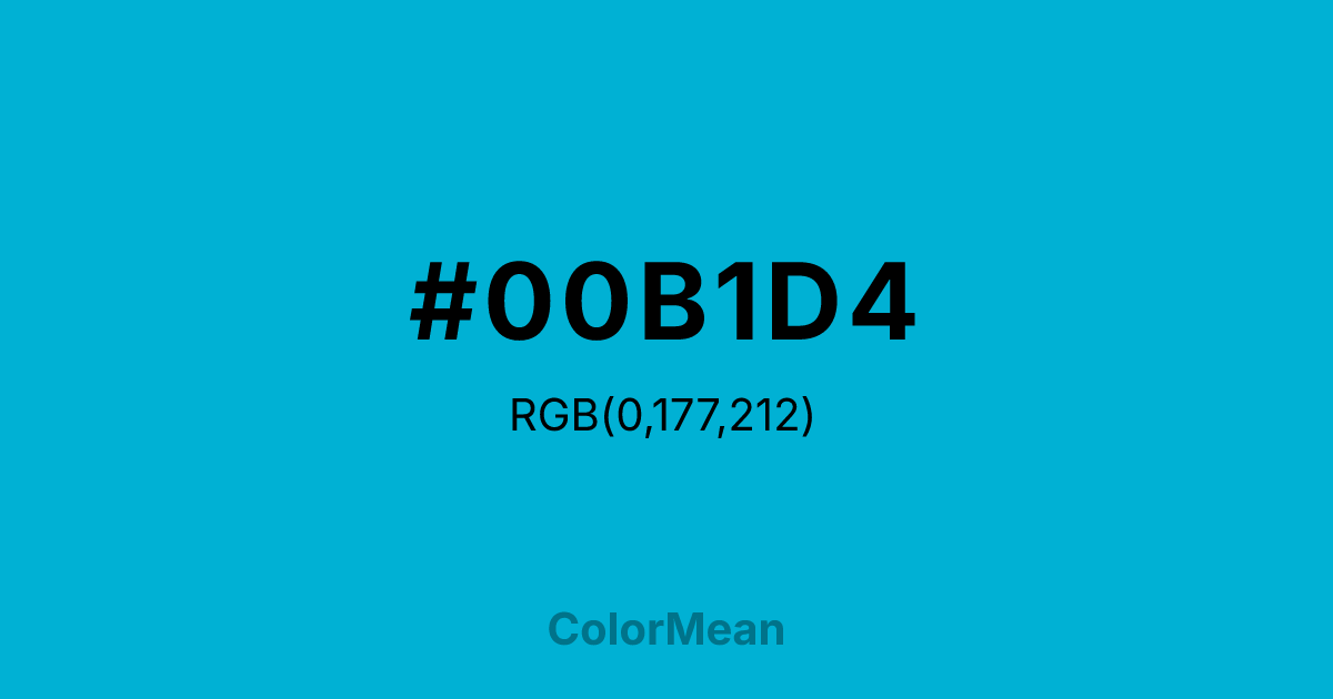 #00B1D4 RGB value is (0, 177, 212). The hex color red value is 0, green is 177, and blue is 212. Its HSL format shows a hue of 190°, saturation of 100 percent, and lightness of 42 percent. The CMYK process values are 100 percent, 17 percent, 0 percent, 17 percent.