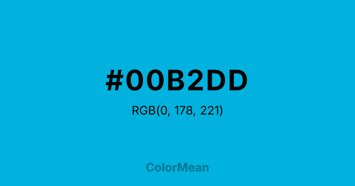 #00B2DD RGB value is (0, 178, 221). The hex color red value is 0, green is 178, and blue is 221. Its HSL format shows a hue of 192°, saturation of 100 percent, and lightness of 43 percent. The CMYK process values are 100 percent, 19 percent, 0 percent, 13 percent.
