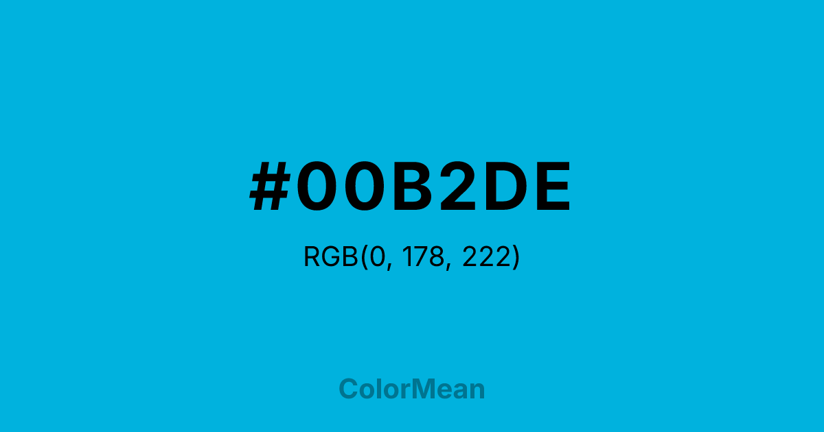 #00B2DE RGB value is (0, 178, 222). The hex color red value is 0, green is 178, and blue is 222. Its HSL format shows a hue of 192°, saturation of 100 percent, and lightness of 44 percent. The CMYK process values are 100 percent, 20 percent, 0 percent, 13 percent.