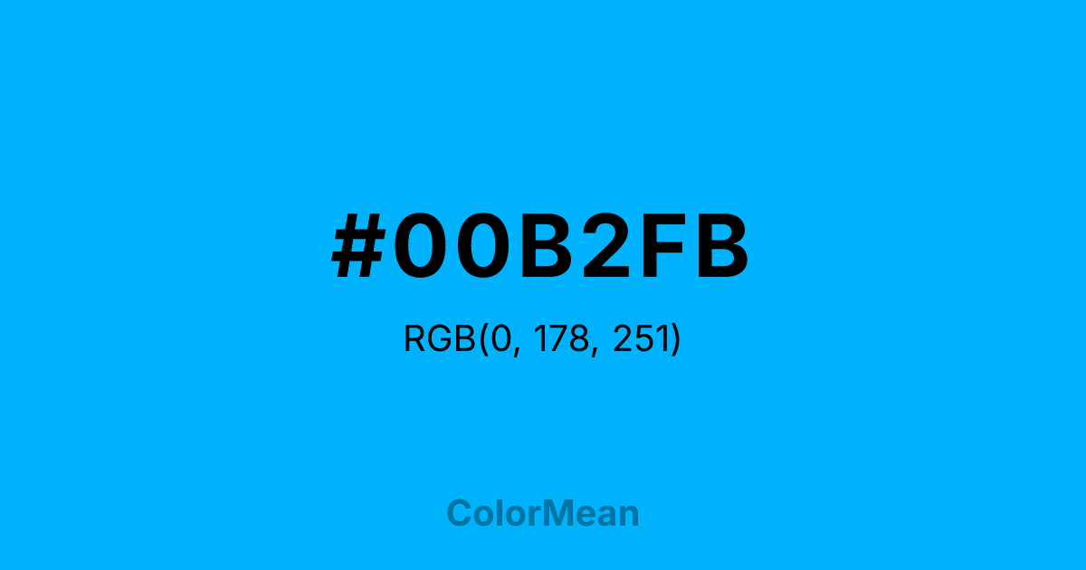 #00B2FB RGB value is (0, 178, 251). The hex color red value is 0, green is 178, and blue is 251. Its HSL format shows a hue of 197°, saturation of 100 percent, and lightness of 49 percent. The CMYK process values are 100 percent, 29 percent, 0 percent, 2 percent.