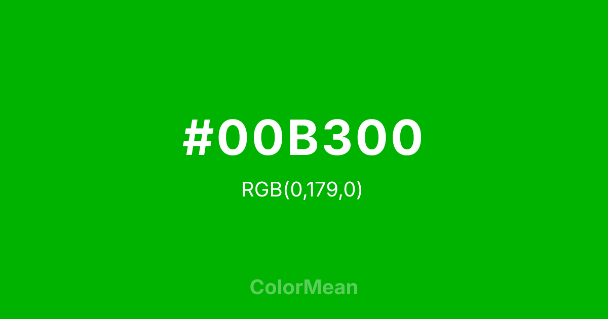 #00B300 RGB value is (0, 179, 0). The hex color red value is 0, green is 179, and blue is 0. Its HSL format shows a hue of 120°, saturation of 100 percent, and lightness of 35 percent. The CMYK process values are 100 percent, 0 percent, 100 percent, 30 percent.