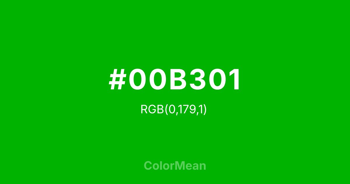 #00B301 RGB value is (0, 179, 1). The hex color red value is 0, green is 179, and blue is 1. Its HSL format shows a hue of 120°, saturation of 100 percent, and lightness of 35 percent. The CMYK process values are 100 percent, 0 percent, 99 percent, 30 percent.