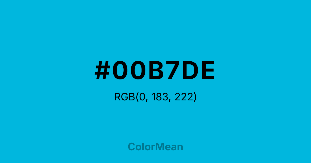 #00B7DE RGB value is (0, 183, 222). The hex color red value is 0, green is 183, and blue is 222. Its HSL format shows a hue of 191°, saturation of 100 percent, and lightness of 44 percent. The CMYK process values are 100 percent, 18 percent, 0 percent, 13 percent.
