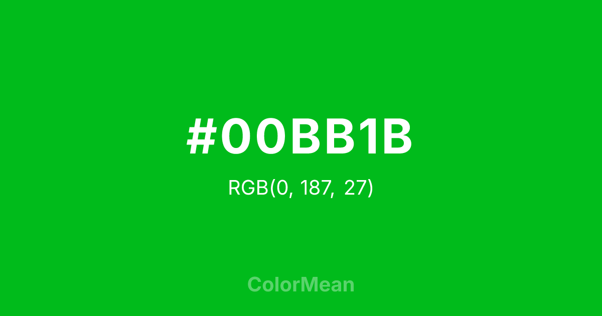 #00BB1B RGB value is (0, 187, 27). The hex color red value is 0, green is 187, and blue is 27. Its HSL format shows a hue of 129°, saturation of 100 percent, and lightness of 37 percent. The CMYK process values are 100 percent, 0 percent, 86 percent, 27 percent.