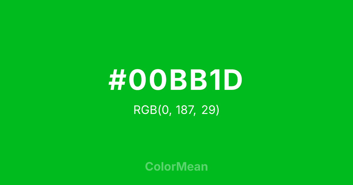 #00BB1D RGB value is (0, 187, 29). The hex color red value is 0, green is 187, and blue is 29. Its HSL format shows a hue of 129°, saturation of 100 percent, and lightness of 37 percent. The CMYK process values are 100 percent, 0 percent, 84 percent, 27 percent.