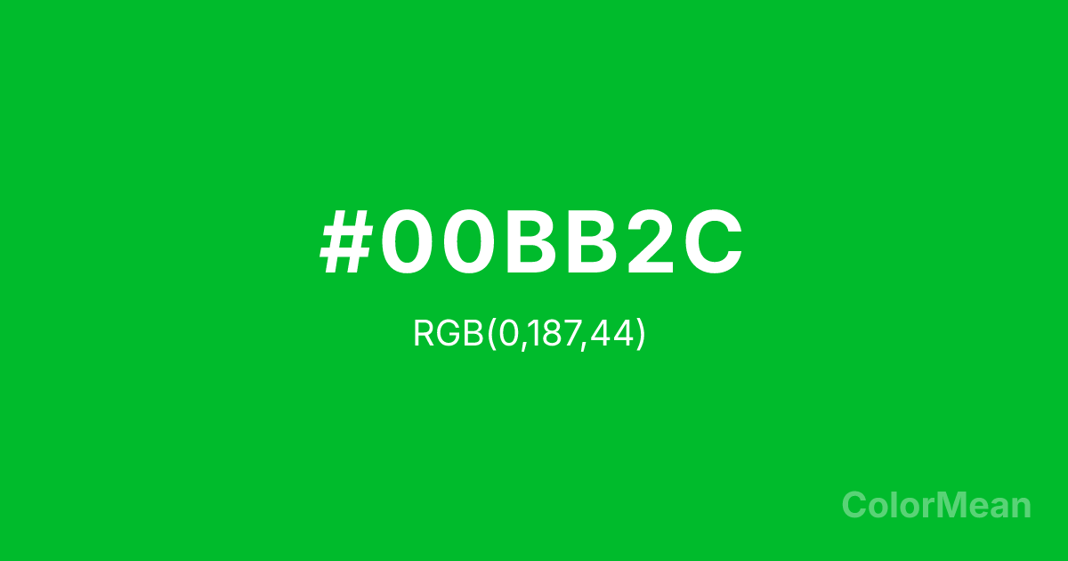 #00BB2C RGB value is (0, 187, 44). The hex color red value is 0, green is 187, and blue is 44. Its HSL format shows a hue of 134°, saturation of 100 percent, and lightness of 37 percent. The CMYK process values are 100 percent, 0 percent, 76 percent, 27 percent.
