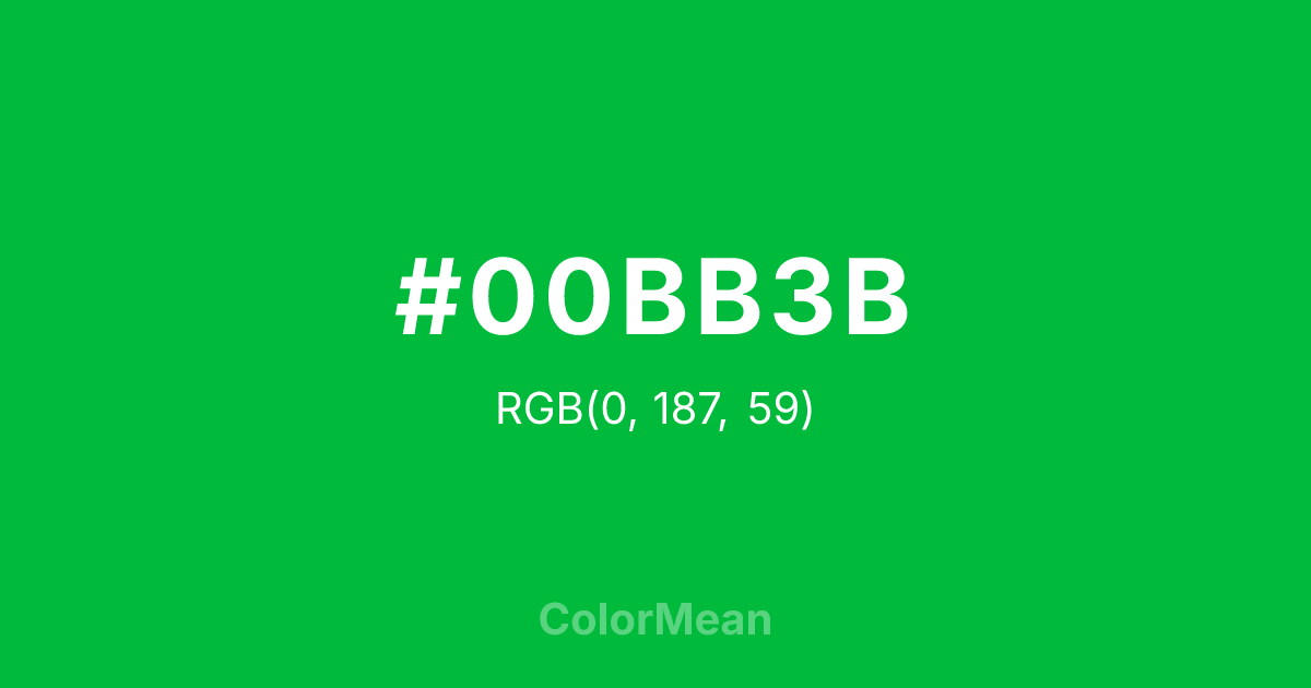 #00BB3B RGB value is (0, 187, 59). The hex color red value is 0, green is 187, and blue is 59. Its HSL format shows a hue of 139°, saturation of 100 percent, and lightness of 37 percent. The CMYK process values are 100 percent, 0 percent, 68 percent, 27 percent.