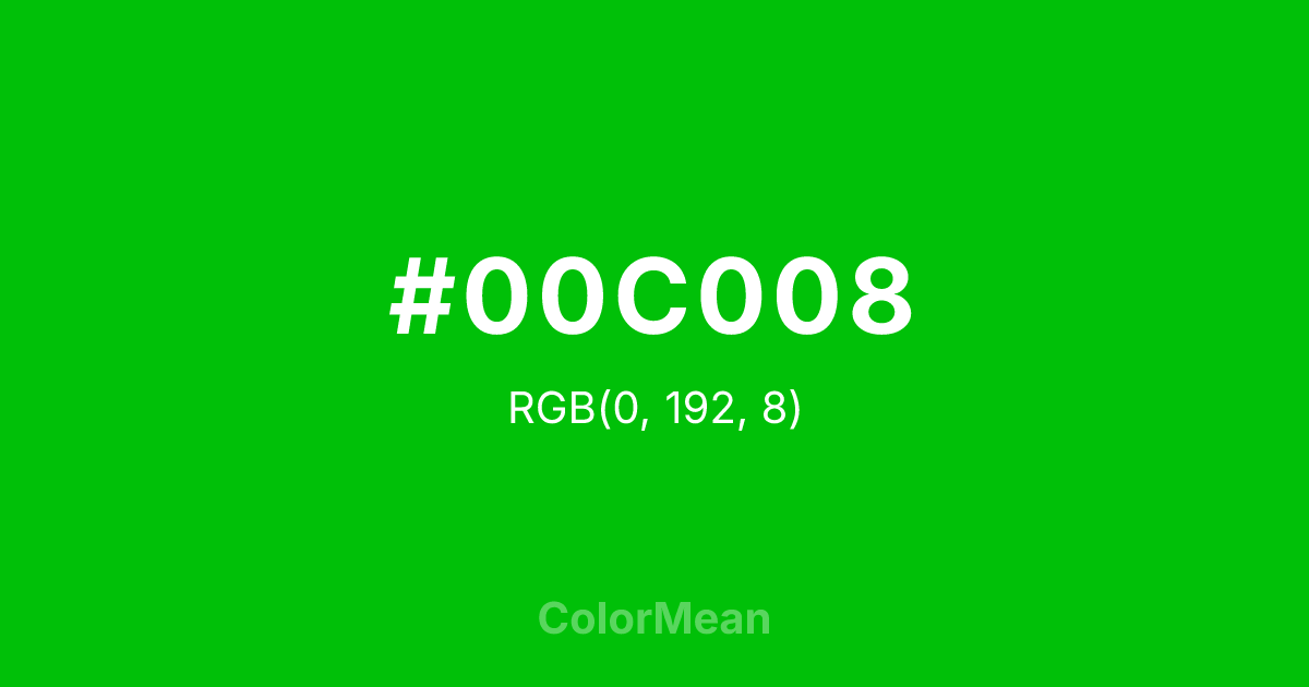 #00C008 RGB value is (0, 192, 8). The hex color red value is 0, green is 192, and blue is 8. Its HSL format shows a hue of 122°, saturation of 100 percent, and lightness of 38 percent. The CMYK process values are 100 percent, 0 percent, 96 percent, 25 percent.
