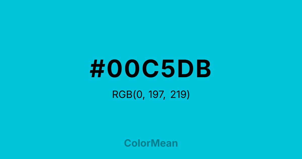 #00C5DB RGB value is (0, 197, 219). The hex color red value is 0, green is 197, and blue is 219. Its HSL format shows a hue of 186°, saturation of 100 percent, and lightness of 43 percent. The CMYK process values are 100 percent, 10 percent, 0 percent, 14 percent.