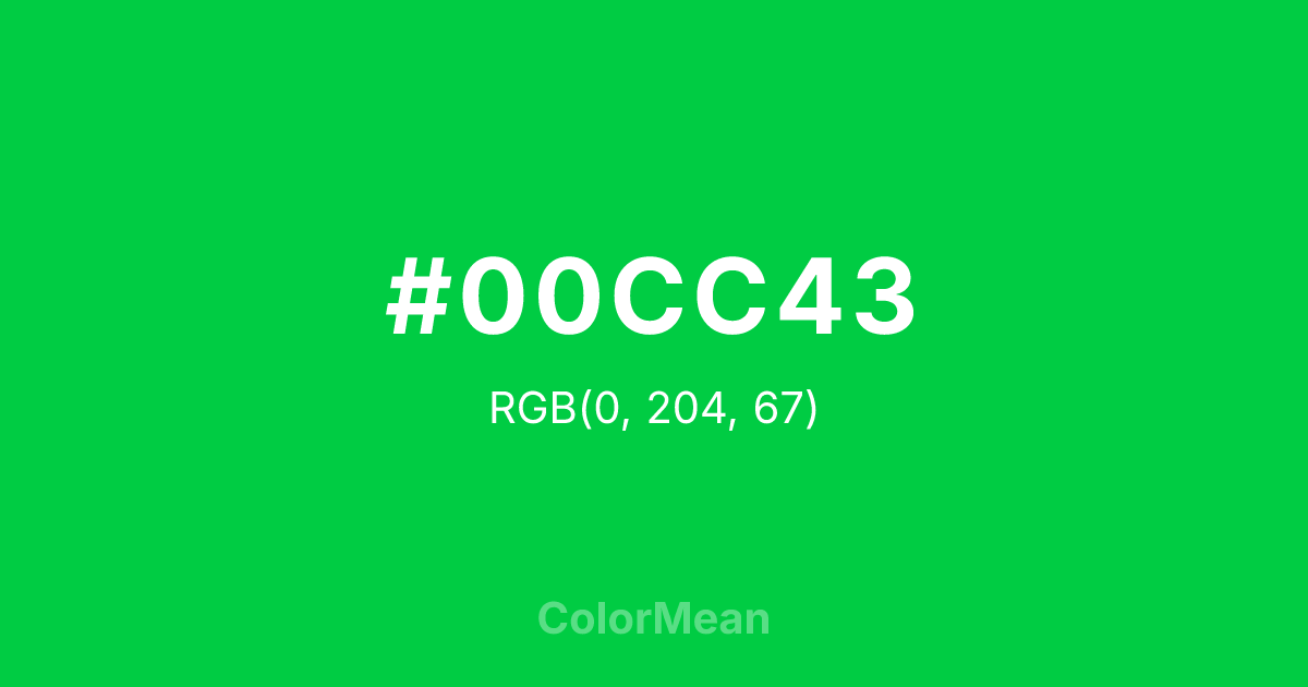 #00CC43 RGB value is (0, 204, 67). The hex color red value is 0, green is 204, and blue is 67. Its HSL format shows a hue of 140°, saturation of 100 percent, and lightness of 40 percent. The CMYK process values are 100 percent, 0 percent, 67 percent, 20 percent.