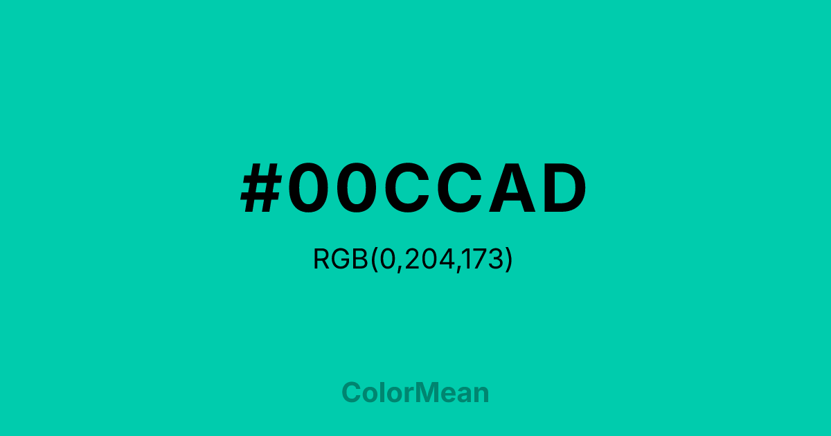 #00CCAD RGB value is (0, 204, 173). The hex color red value is 0, green is 204, and blue is 173. Its HSL format shows a hue of 171°, saturation of 100 percent, and lightness of 40 percent. The CMYK process values are 100 percent, 0 percent, 15 percent, 20 percent.