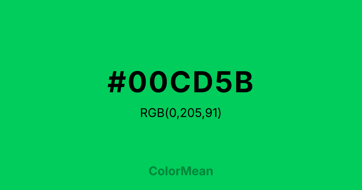 #00CD5B RGB value is (0, 205, 91). The hex color red value is 0, green is 205, and blue is 91. Its HSL format shows a hue of 147°, saturation of 100 percent, and lightness of 40 percent. The CMYK process values are 100 percent, 0 percent, 56 percent, 20 percent.