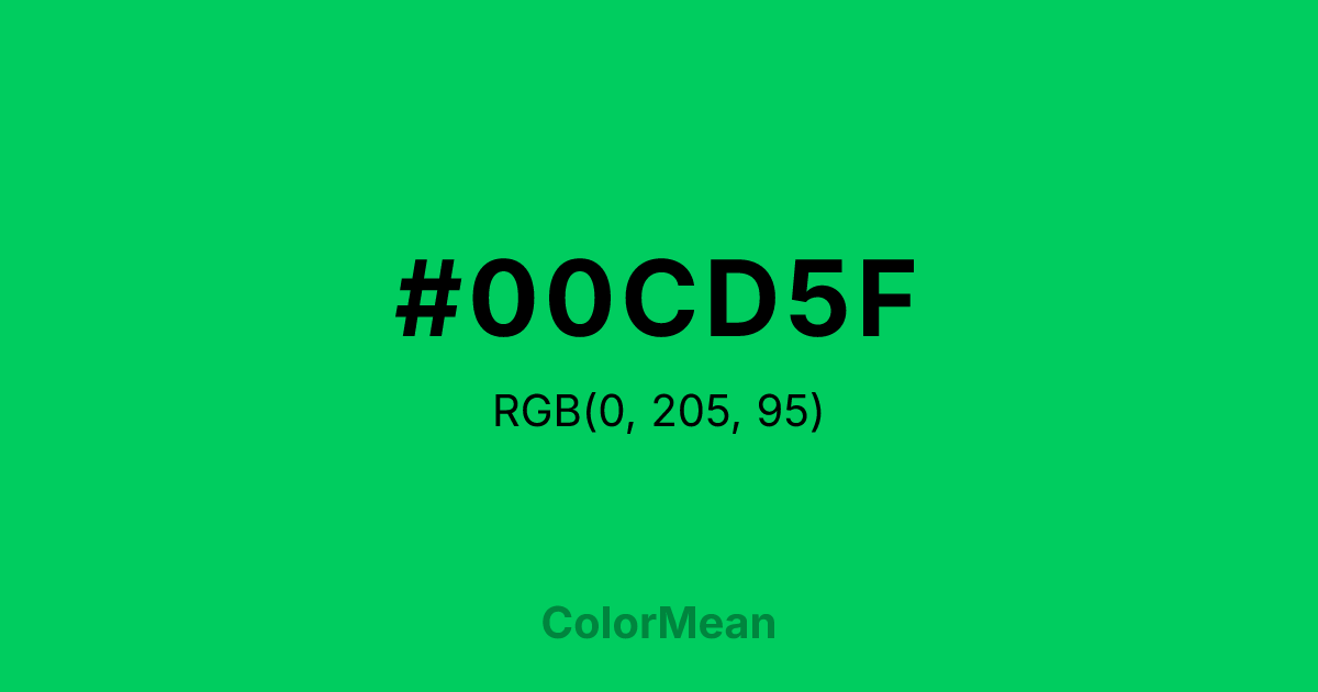 #00CD5F RGB value is (0, 205, 95). The hex color red value is 0, green is 205, and blue is 95. Its HSL format shows a hue of 148°, saturation of 100 percent, and lightness of 40 percent. The CMYK process values are 100 percent, 0 percent, 54 percent, 20 percent.