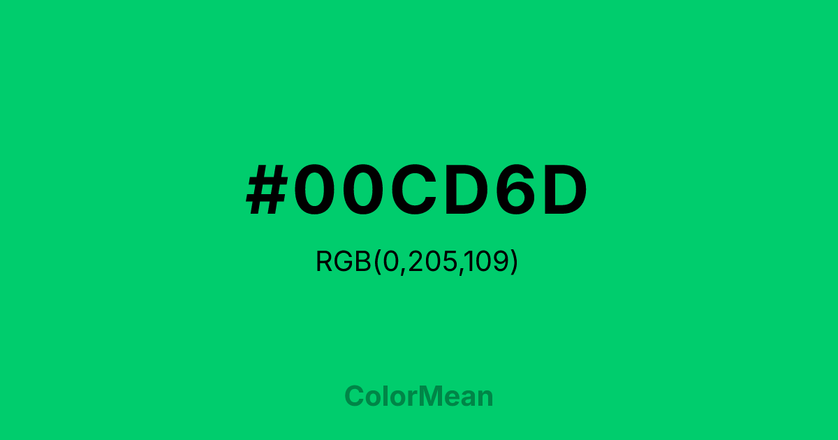 #00CD6D RGB value is (0, 205, 109). The hex color red value is 0, green is 205, and blue is 109. Its HSL format shows a hue of 152°, saturation of 100 percent, and lightness of 40 percent. The CMYK process values are 100 percent, 0 percent, 47 percent, 20 percent.
