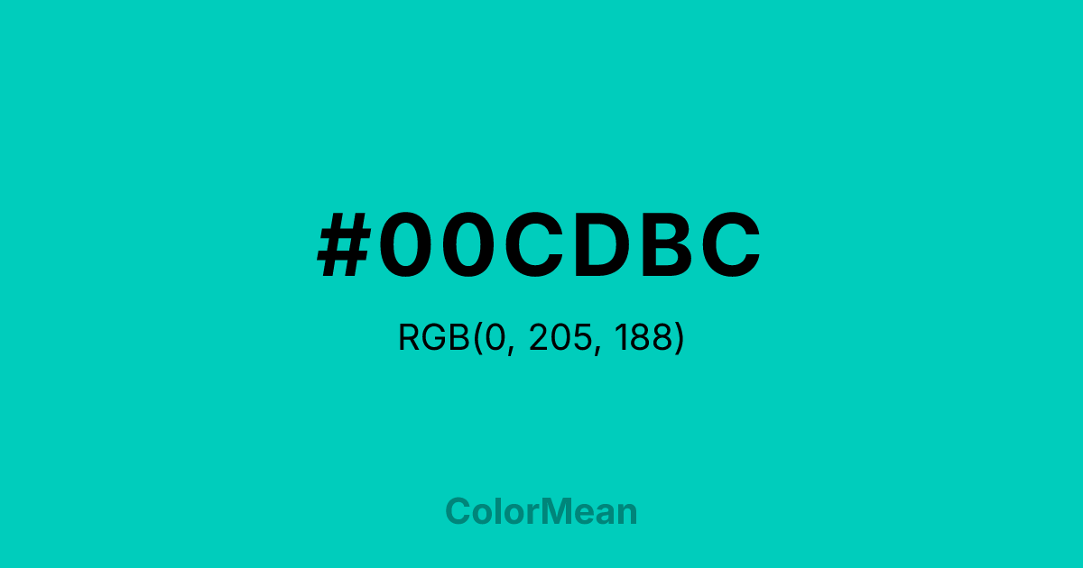 #00CDBC RGB value is (0, 205, 188). The hex color red value is 0, green is 205, and blue is 188. Its HSL format shows a hue of 175°, saturation of 100 percent, and lightness of 40 percent. The CMYK process values are 100 percent, 0 percent, 8 percent, 20 percent.