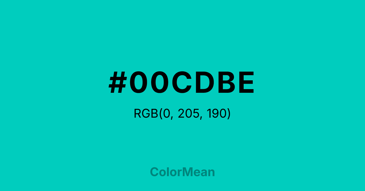 #00CDBE RGB value is (0, 205, 190). The hex color red value is 0, green is 205, and blue is 190. Its HSL format shows a hue of 176°, saturation of 100 percent, and lightness of 40 percent. The CMYK process values are 100 percent, 0 percent, 7 percent, 20 percent.