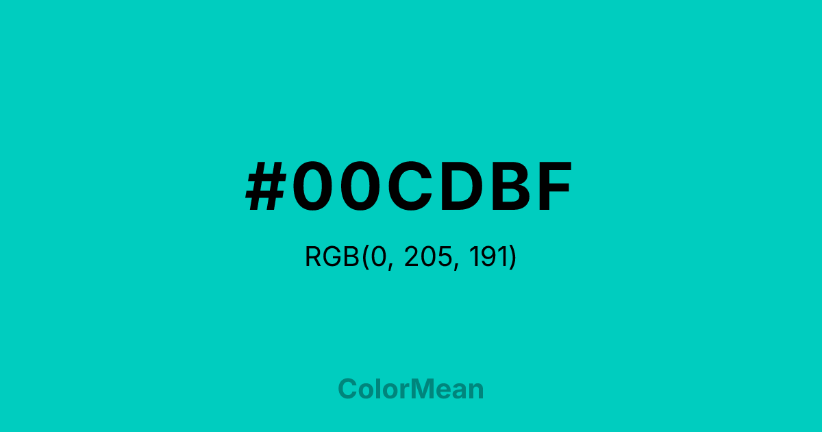 #00CDBF RGB value is (0, 205, 191). The hex color red value is 0, green is 205, and blue is 191. Its HSL format shows a hue of 176°, saturation of 100 percent, and lightness of 40 percent. The CMYK process values are 100 percent, 0 percent, 7 percent, 20 percent.