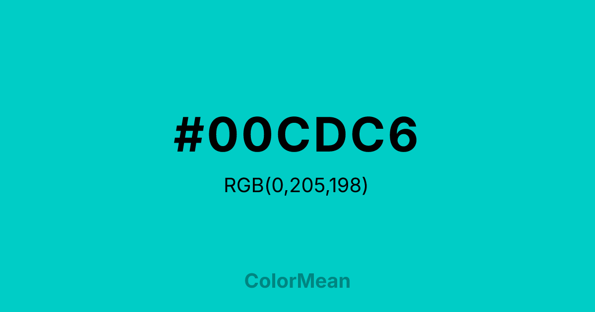 #00CDC6 RGB value is (0, 205, 198). The hex color red value is 0, green is 205, and blue is 198. Its HSL format shows a hue of 178°, saturation of 100 percent, and lightness of 40 percent. The CMYK process values are 100 percent, 0 percent, 3 percent, 20 percent.