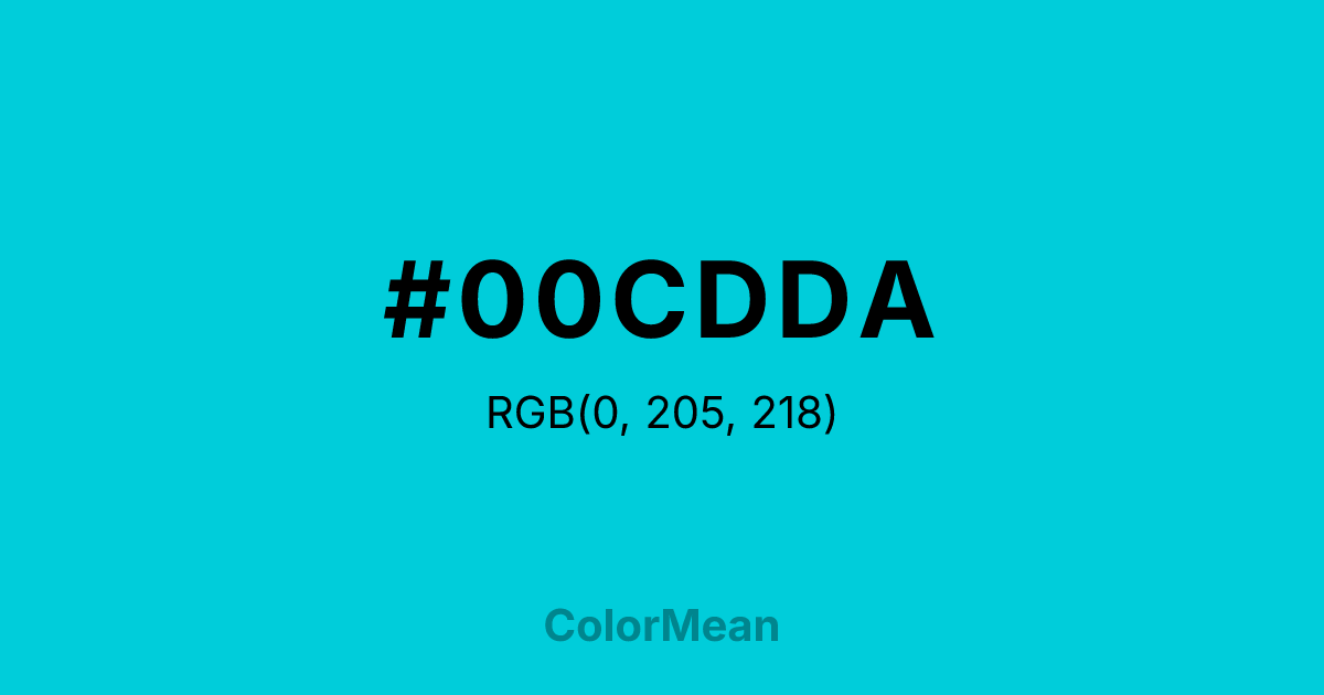 #00CDDA RGB value is (0, 205, 218). The hex color red value is 0, green is 205, and blue is 218. Its HSL format shows a hue of 184°, saturation of 100 percent, and lightness of 43 percent. The CMYK process values are 100 percent, 6 percent, 0 percent, 15 percent.