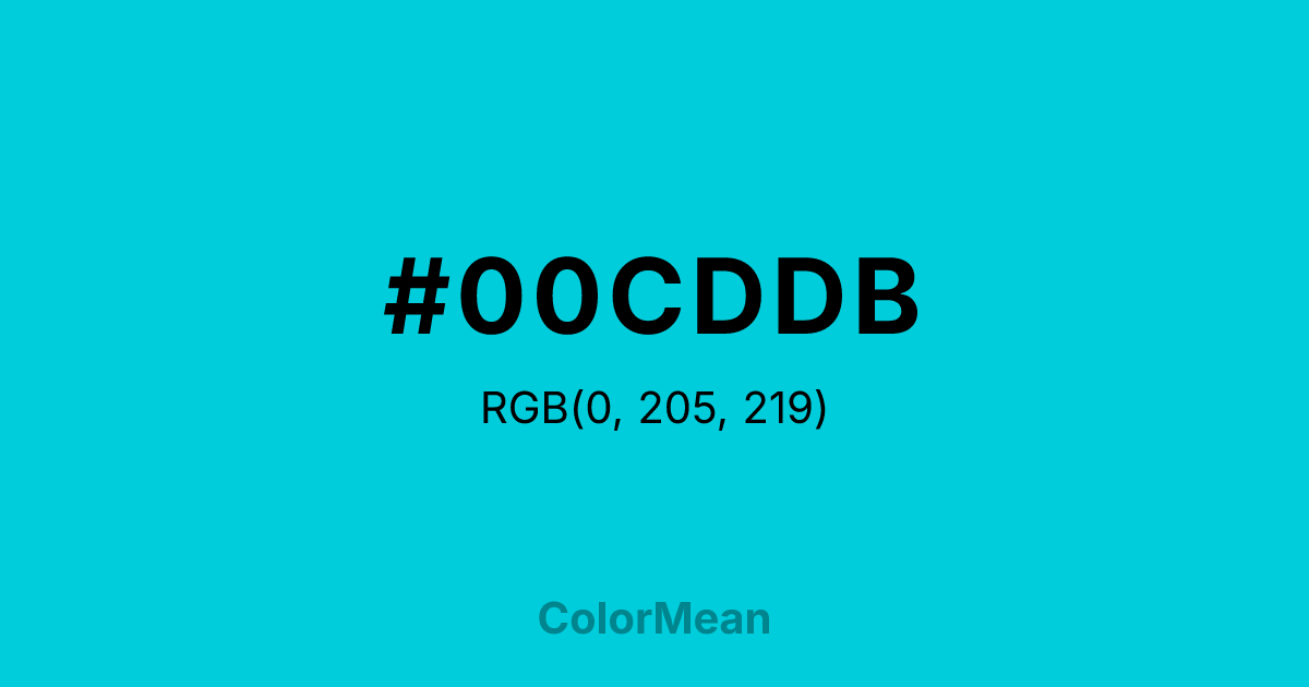 #00CDDB RGB value is (0, 205, 219). The hex color red value is 0, green is 205, and blue is 219. Its HSL format shows a hue of 184°, saturation of 100 percent, and lightness of 43 percent. The CMYK process values are 100 percent, 6 percent, 0 percent, 14 percent.