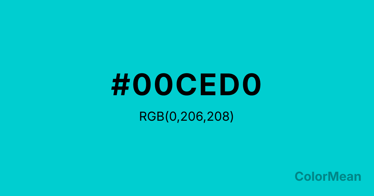 #00CED0 RGB value is (0, 206, 208). The hex color red value is 0, green is 206, and blue is 208. Its HSL format shows a hue of 181°, saturation of 100 percent, and lightness of 41 percent. The CMYK process values are 100 percent, 1 percent, 0 percent, 18 percent.