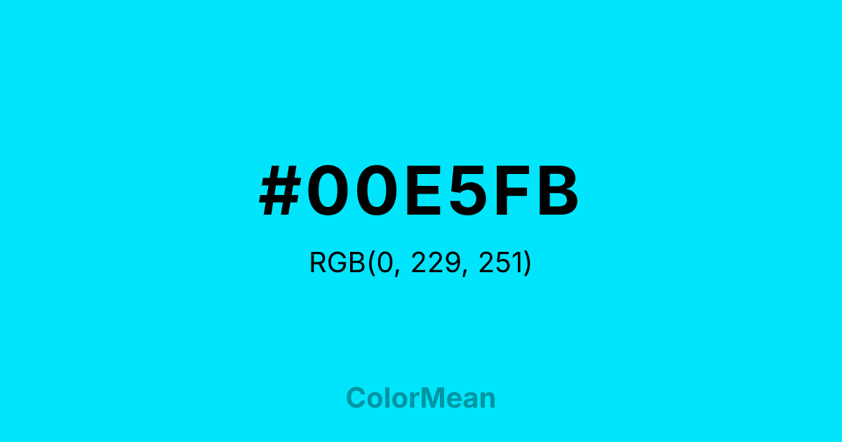 #00E5FB RGB value is (0, 229, 251). The hex color red value is 0, green is 229, and blue is 251. Its HSL format shows a hue of 185°, saturation of 100 percent, and lightness of 49 percent. The CMYK process values are 100 percent, 9 percent, 0 percent, 2 percent.