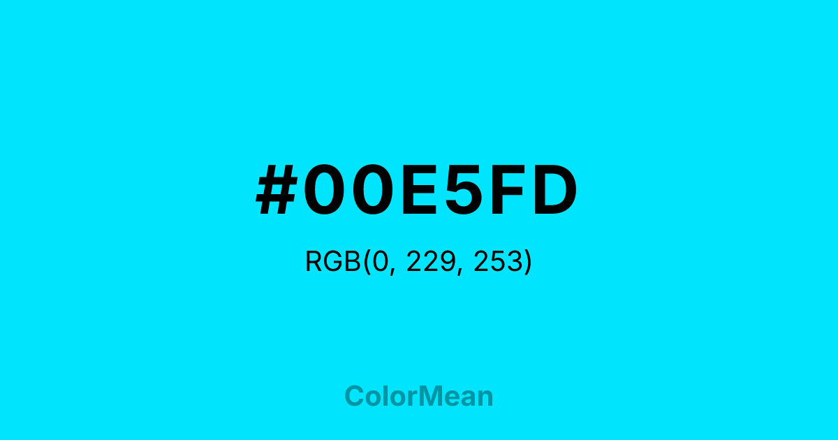 #00E5FD RGB value is (0, 229, 253). The hex color red value is 0, green is 229, and blue is 253. Its HSL format shows a hue of 186°, saturation of 100 percent, and lightness of 50 percent. The CMYK process values are 100 percent, 9 percent, 0 percent, 1 percent.