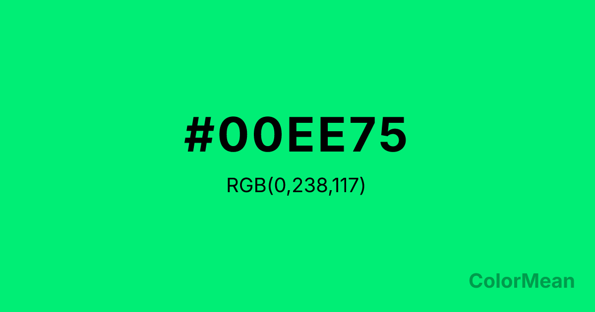 #00EE75 RGB value is (0, 238, 117). The hex color red value is 0, green is 238, and blue is 117. Its HSL format shows a hue of 149°, saturation of 100 percent, and lightness of 47 percent. The CMYK process values are 100 percent, 0 percent, 51 percent, 7 percent.