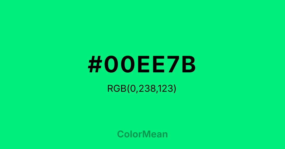 #00EE7B RGB value is (0, 238, 123). The hex color red value is 0, green is 238, and blue is 123. Its HSL format shows a hue of 151°, saturation of 100 percent, and lightness of 47 percent. The CMYK process values are 100 percent, 0 percent, 48 percent, 7 percent.