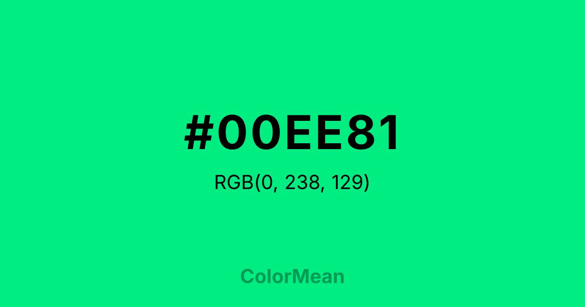 #00EE81 RGB value is (0, 238, 129). The hex color red value is 0, green is 238, and blue is 129. Its HSL format shows a hue of 153°, saturation of 100 percent, and lightness of 47 percent. The CMYK process values are 100 percent, 0 percent, 46 percent, 7 percent.