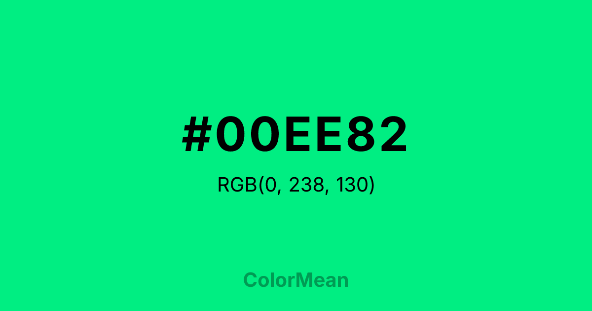#00EE82 RGB value is (0, 238, 130). The hex color red value is 0, green is 238, and blue is 130. Its HSL format shows a hue of 153°, saturation of 100 percent, and lightness of 47 percent. The CMYK process values are 100 percent, 0 percent, 45 percent, 7 percent.