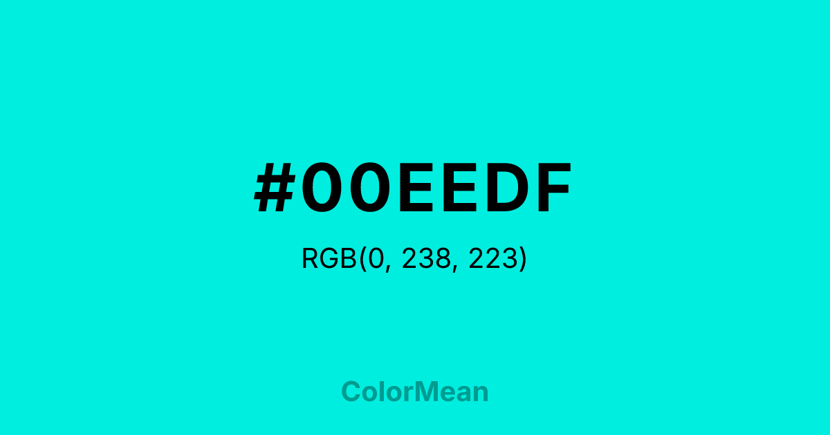 #00EEDF RGB value is (0, 238, 223). The hex color red value is 0, green is 238, and blue is 223. Its HSL format shows a hue of 176°, saturation of 100 percent, and lightness of 47 percent. The CMYK process values are 100 percent, 0 percent, 6 percent, 7 percent.