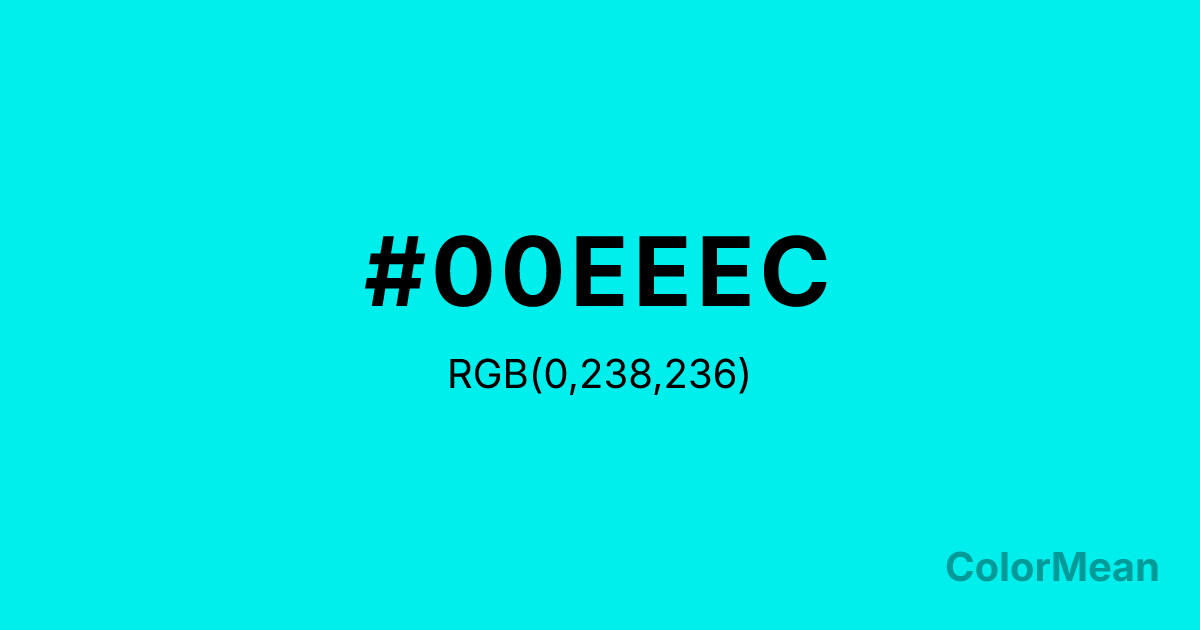 #00EEEC RGB value is (0, 238, 236). The hex color red value is 0, green is 238, and blue is 236. Its HSL format shows a hue of 179°, saturation of 100 percent, and lightness of 47 percent. The CMYK process values are 100 percent, 0 percent, 1 percent, 7 percent.