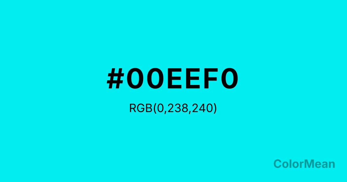 #00EEF0 RGB value is (0, 238, 240). The hex color red value is 0, green is 238, and blue is 240. Its HSL format shows a hue of 181°, saturation of 100 percent, and lightness of 47 percent. The CMYK process values are 100 percent, 1 percent, 0 percent, 6 percent.