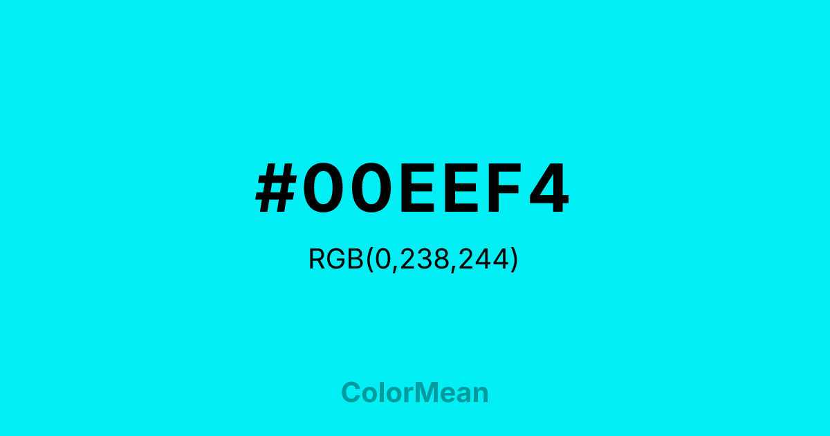#00EEF4 RGB value is (0, 238, 244). The hex color red value is 0, green is 238, and blue is 244. Its HSL format shows a hue of 181°, saturation of 100 percent, and lightness of 48 percent. The CMYK process values are 100 percent, 2 percent, 0 percent, 4 percent.