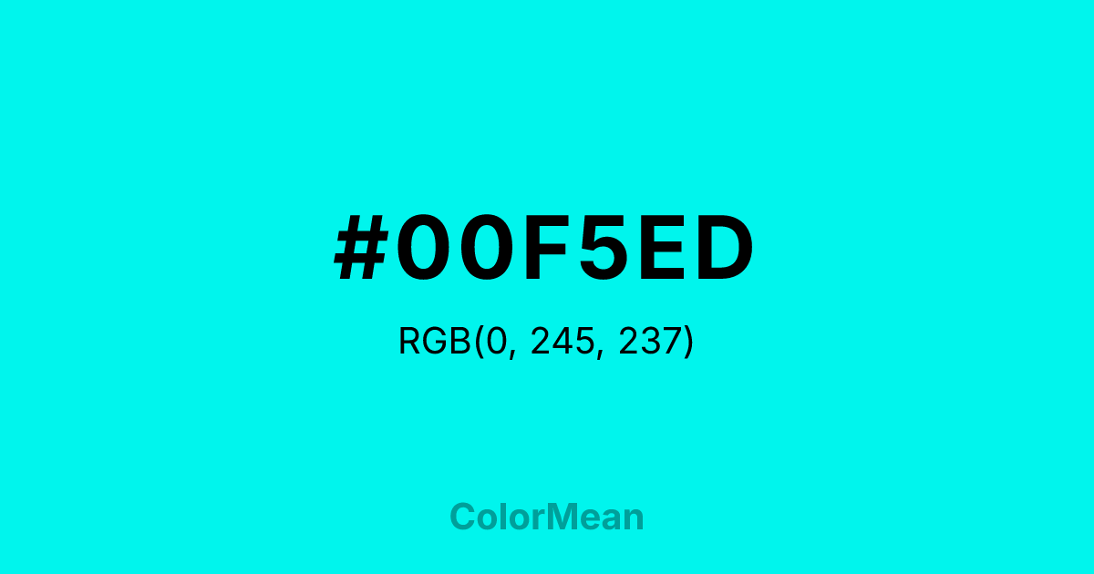 #00F5ED RGB value is (0, 245, 237). The hex color red value is 0, green is 245, and blue is 237. Its HSL format shows a hue of 178°, saturation of 100 percent, and lightness of 48 percent. The CMYK process values are 100 percent, 0 percent, 3 percent, 4 percent.