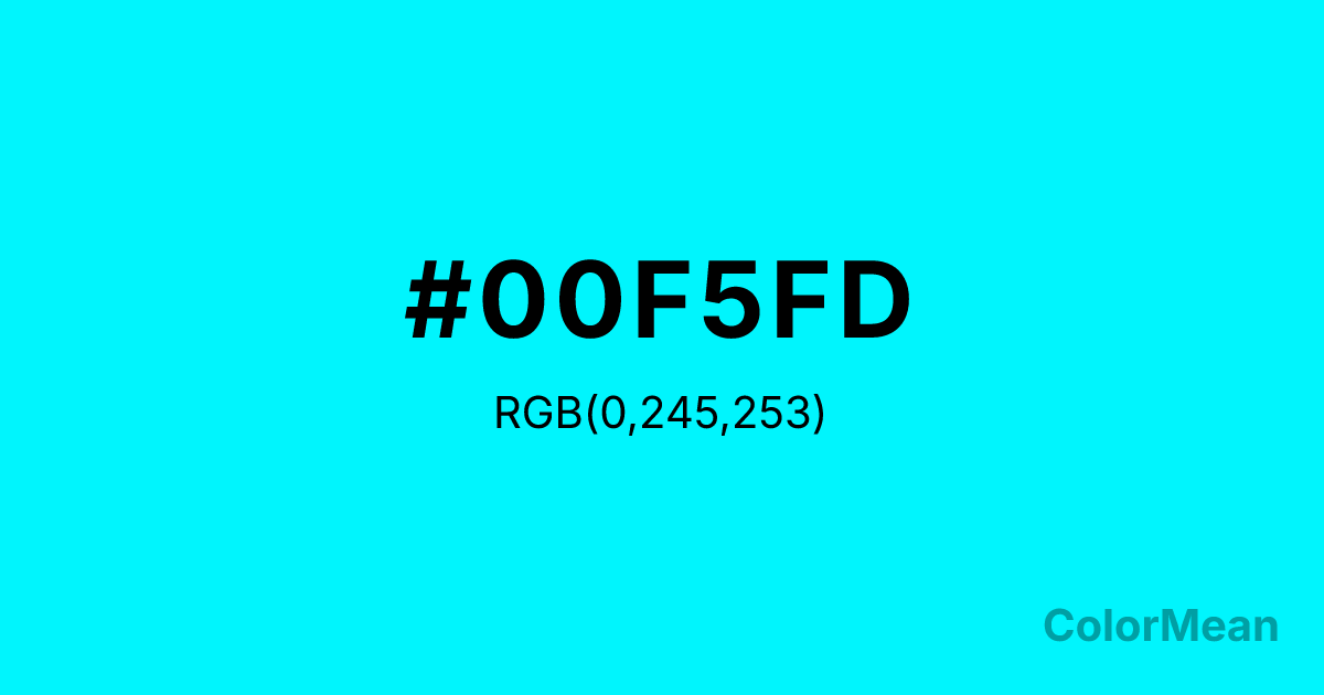 #00F5FD RGB value is (0, 245, 253). The hex color red value is 0, green is 245, and blue is 253. Its HSL format shows a hue of 182°, saturation of 100 percent, and lightness of 50 percent. The CMYK process values are 100 percent, 3 percent, 0 percent, 1 percent.