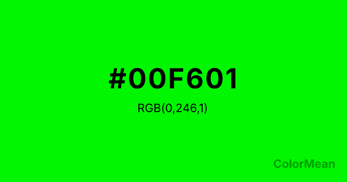 #00F601 RGB value is (0, 246, 1). The hex color red value is 0, green is 246, and blue is 1. Its HSL format shows a hue of 120°, saturation of 100 percent, and lightness of 48 percent. The CMYK process values are 100 percent, 0 percent, 100 percent, 4 percent.