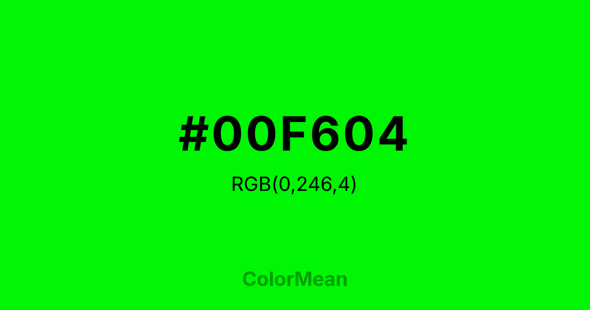 #00F604 RGB value is (0, 246, 4). The hex color red value is 0, green is 246, and blue is 4. Its HSL format shows a hue of 121°, saturation of 100 percent, and lightness of 48 percent. The CMYK process values are 100 percent, 0 percent, 98 percent, 4 percent.