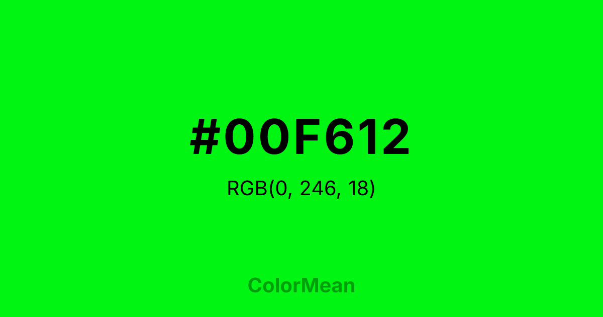 #00F612 RGB value is (0, 246, 18). The hex color red value is 0, green is 246, and blue is 18. Its HSL format shows a hue of 124°, saturation of 100 percent, and lightness of 48 percent. The CMYK process values are 100 percent, 0 percent, 93 percent, 4 percent.