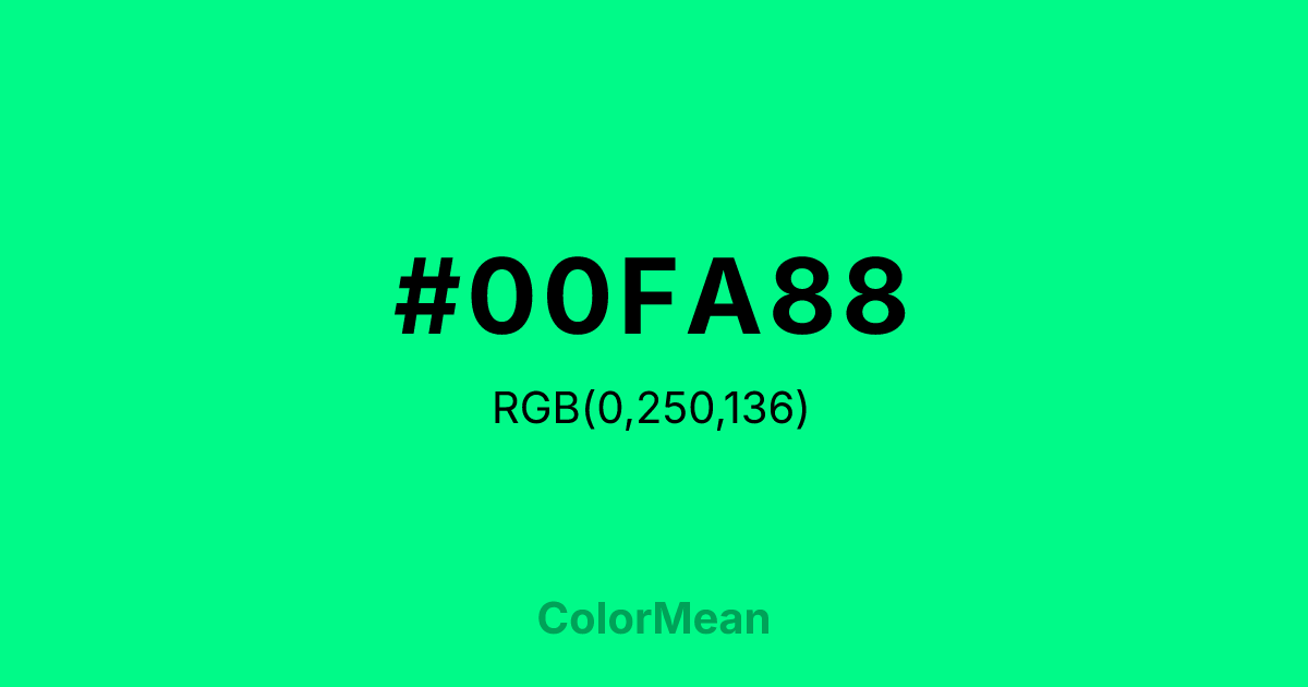 #00FA88 RGB value is (0, 250, 136). The hex color red value is 0, green is 250, and blue is 136. Its HSL format shows a hue of 153°, saturation of 100 percent, and lightness of 49 percent. The CMYK process values are 100 percent, 0 percent, 46 percent, 2 percent.