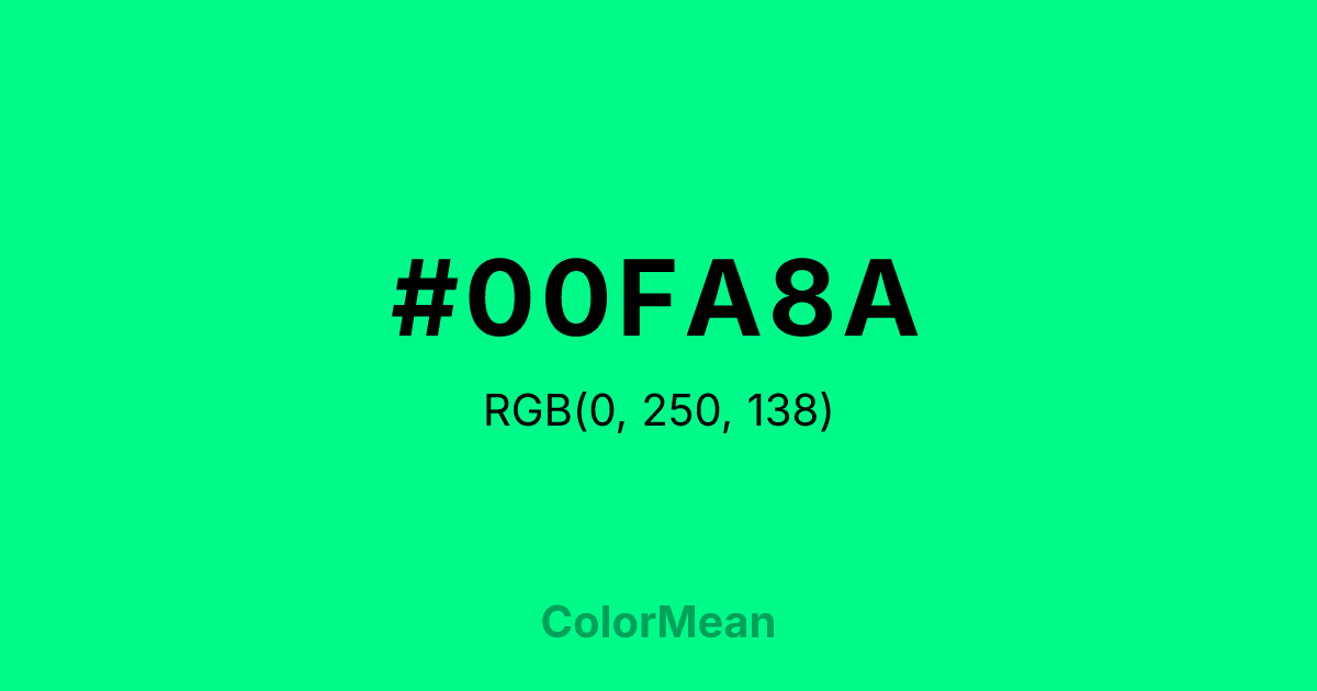 #00FA8A RGB value is (0, 250, 138). The hex color red value is 0, green is 250, and blue is 138. Its HSL format shows a hue of 153°, saturation of 100 percent, and lightness of 49 percent. The CMYK process values are 100 percent, 0 percent, 45 percent, 2 percent.