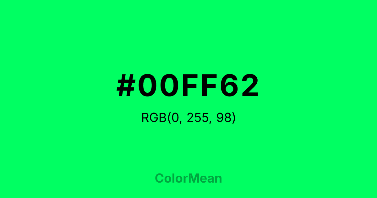 #00FF62 RGB value is (0, 255, 98). The hex color red value is 0, green is 255, and blue is 98. Its HSL format shows a hue of 143°, saturation of 100 percent, and lightness of 50 percent. The CMYK process values are 100 percent, 0 percent, 62 percent, 0 percent.
